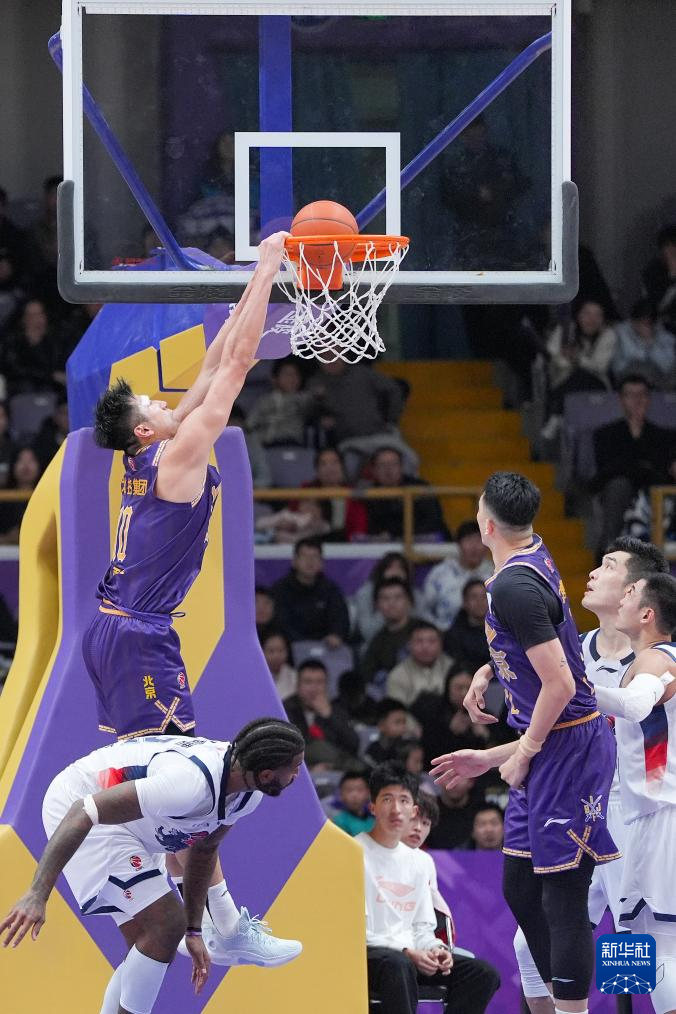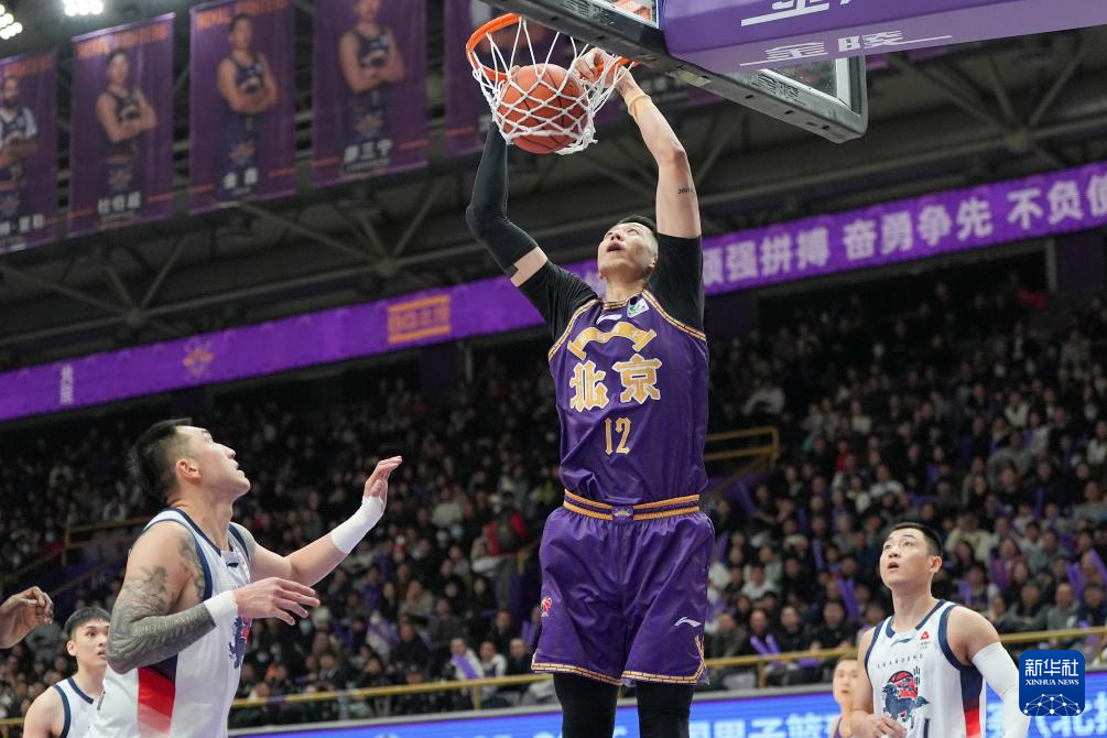 12月13日,北京控股队球员沈梓捷(中)在比赛中扣篮。