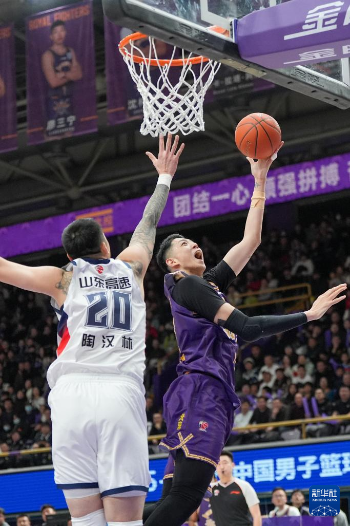 12月13日,北京控股队球员廖三宁(右)在比赛中上篮。
