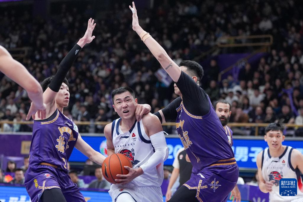 12月13日,北京控股队球员廖三宁(右一)在比赛中防守山东高速队球员克里斯(右二)的进攻。