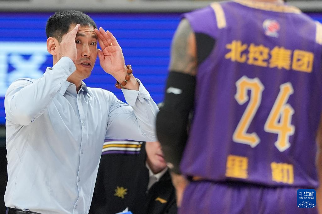 12月13日,北京控股队主教练张庆鹏(左)在比赛中与球员交流。